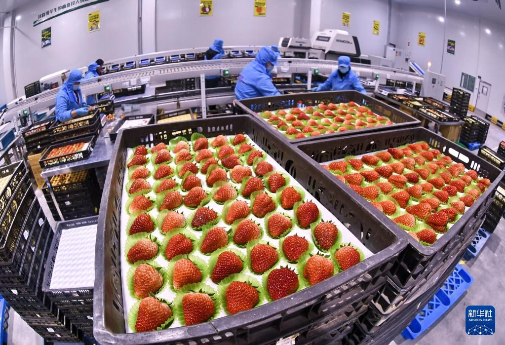 1月14日,村民在低温包装车间进行草莓筛选包装。