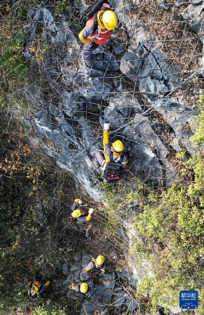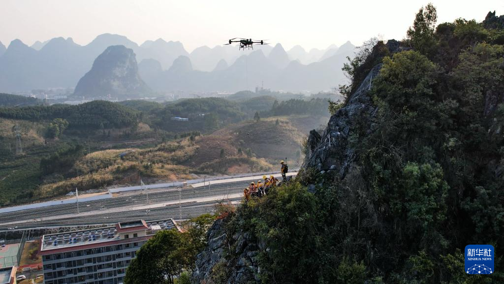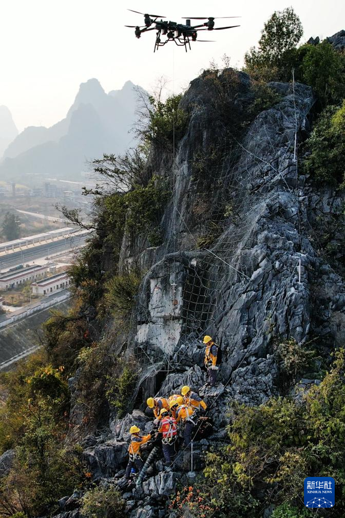 1月15日,在广西河池市东江镇的黔桂铁路一处沿线山体上,桥隧工利用无人机运输的材料对危石进行整治(无人机照片)。