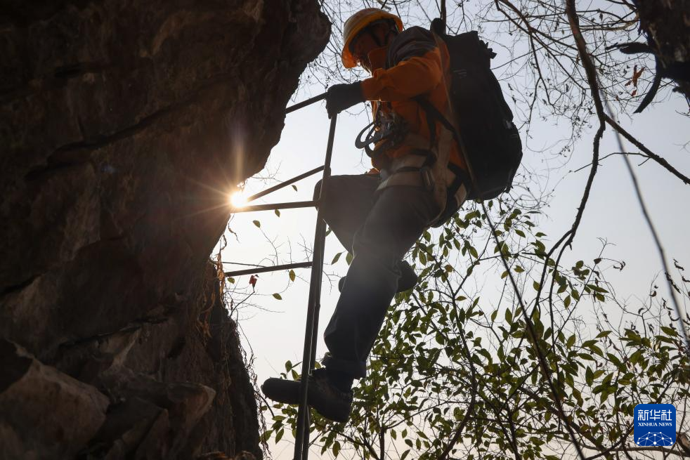 1月15日,一名桥隧工在广西河池市东江镇攀爬黔桂铁路东江隧道的附近山体,准备上山排查危石和隐患。