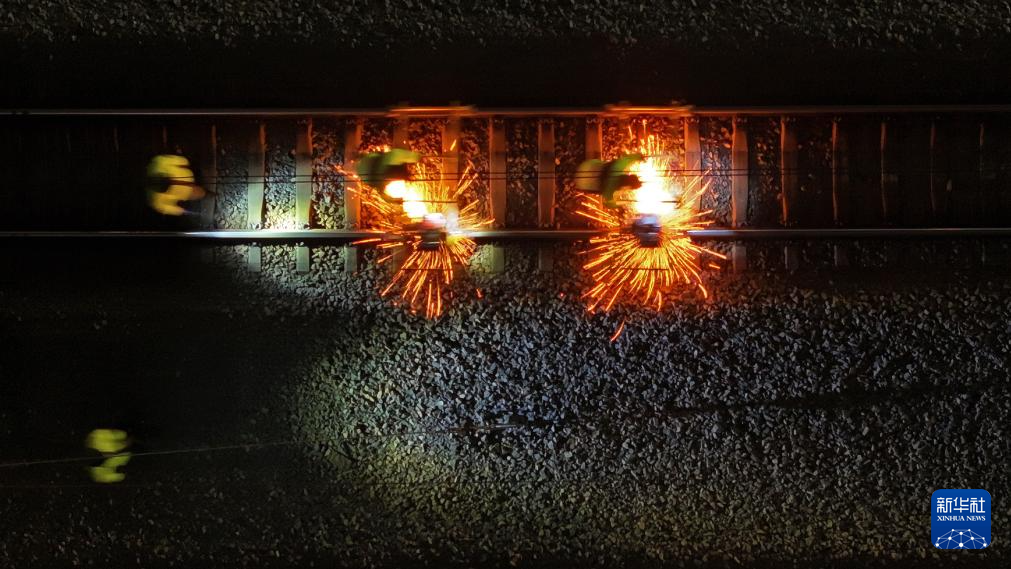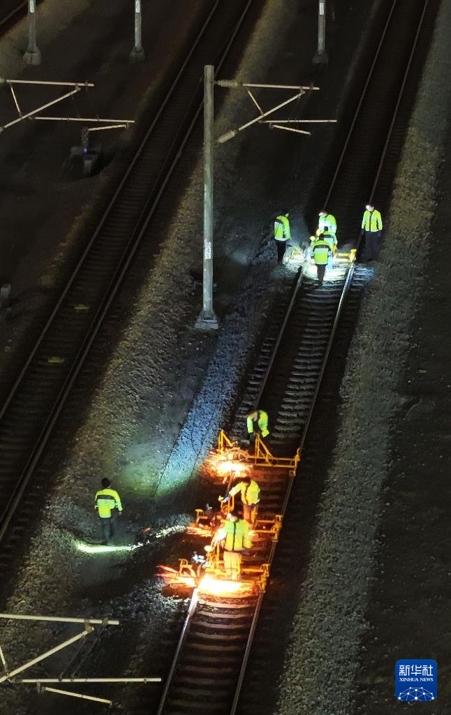1月16日凌晨,长沙高铁工务段线路工在长沙南站沪昆场打磨钢轨(无人机照片)。