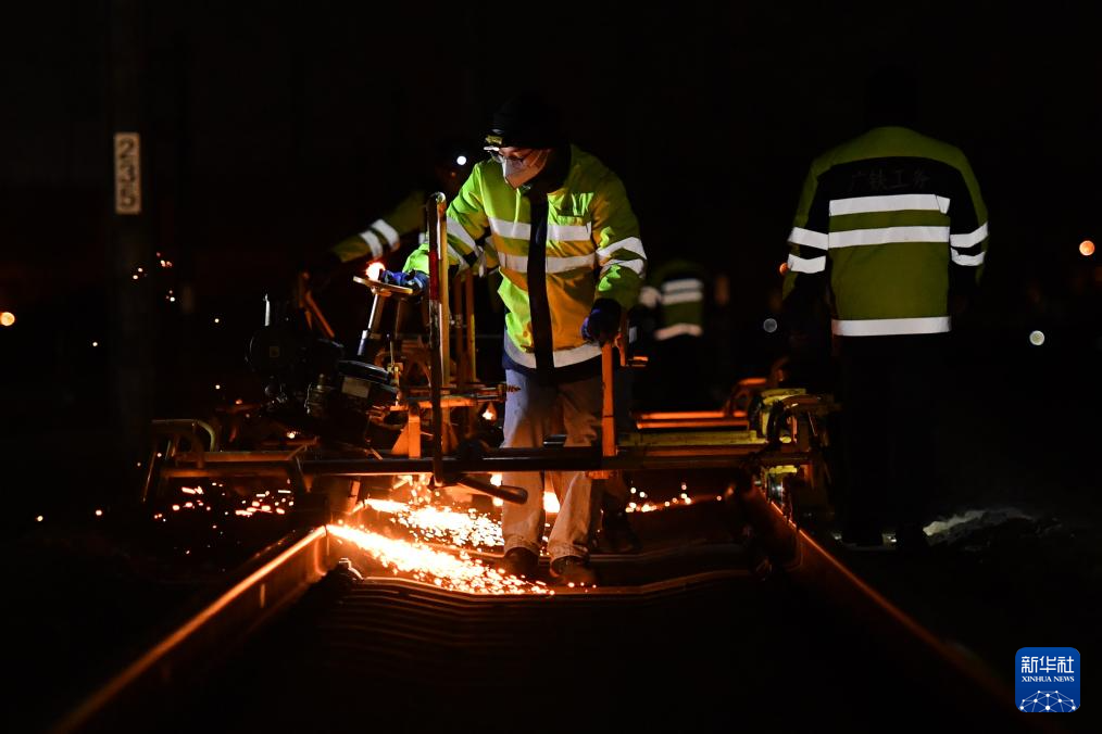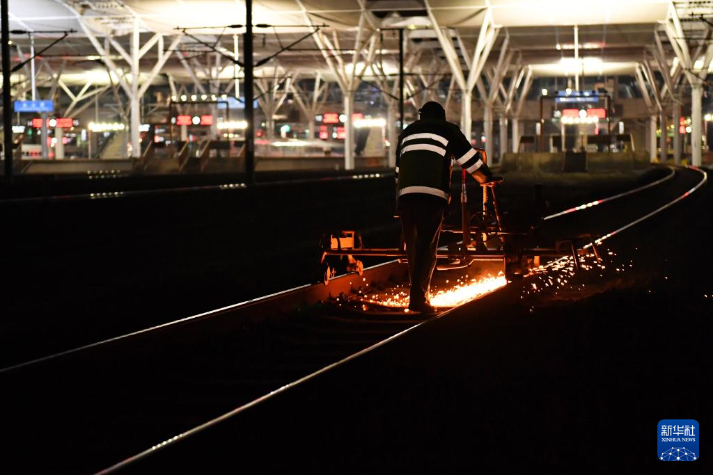 1月16日凌晨,长沙高铁工务段线路工在长沙南站沪昆场打磨钢轨。
