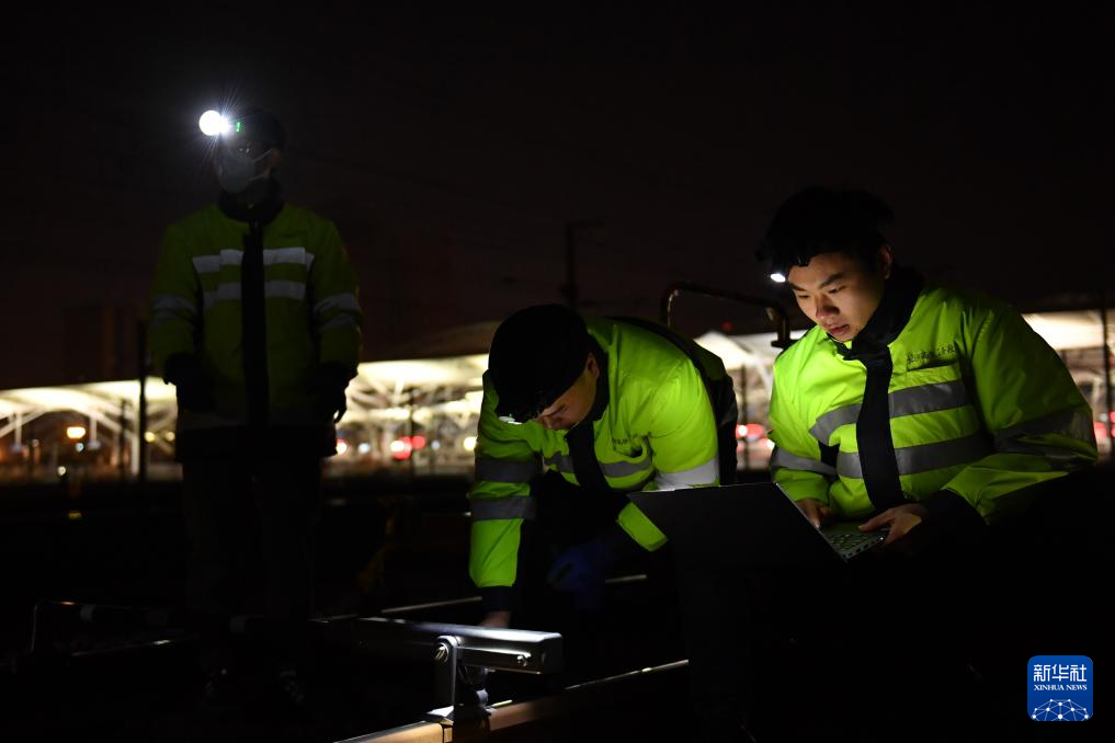 1月16日凌晨,长沙高铁工务段线路工在长沙南站沪昆场作业前测量钢轨廓形。