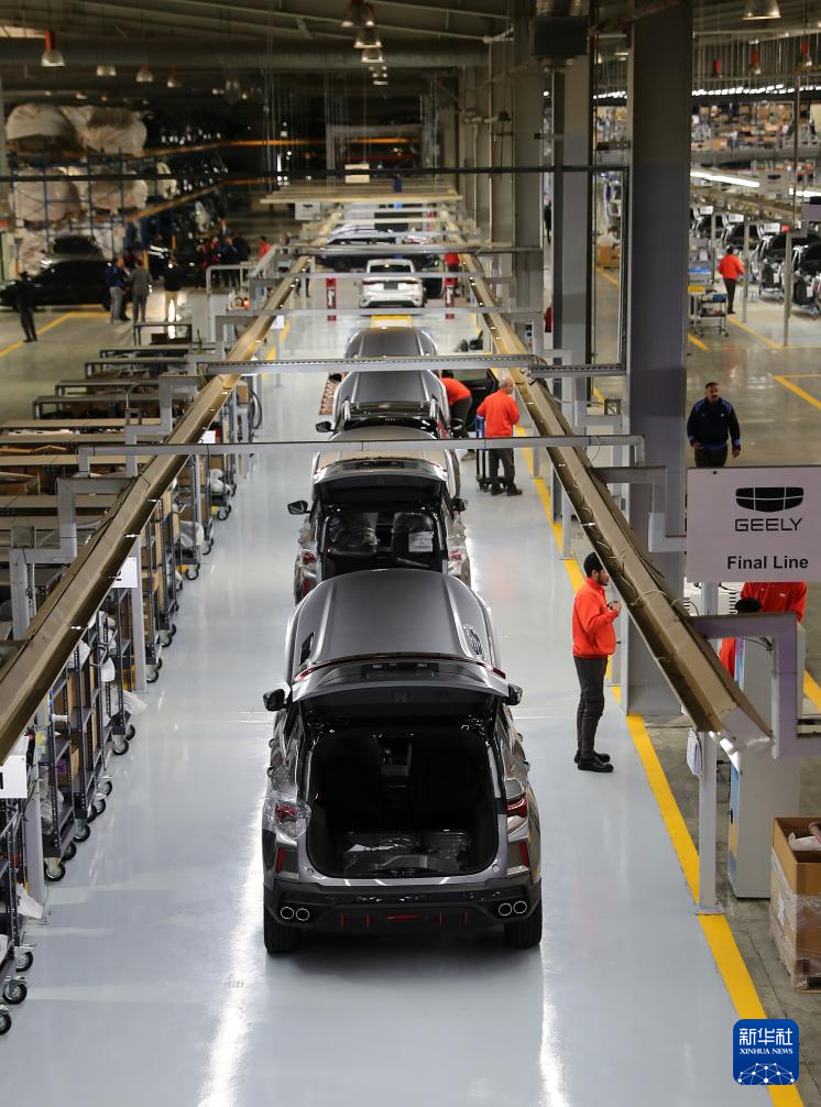 这是1月15日在埃及吉萨省十月六日城拍摄的吉利汽车埃及工厂生产线。