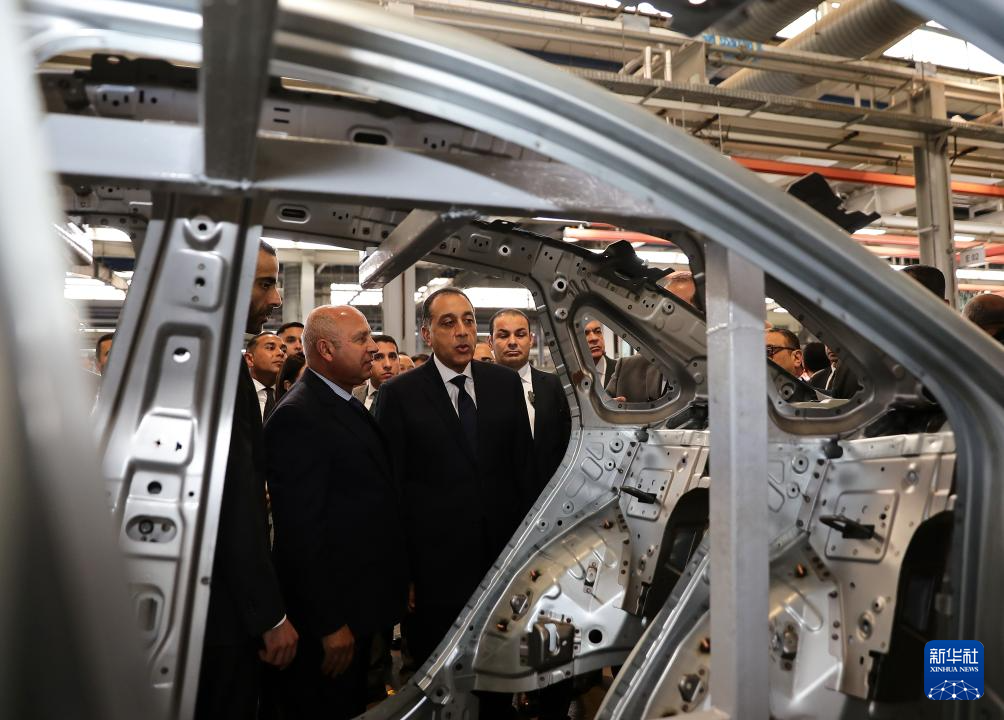 1月15日,在埃及吉萨省的十月六日城,埃及总理马德布利(前右)参观吉利汽车埃及工厂生产线。