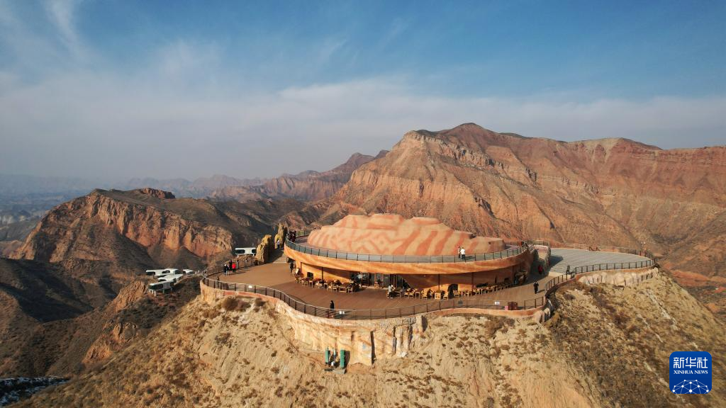 1月17日,游客在兰州水墨丹霞景区的观景平台上游览(无人机照片)。