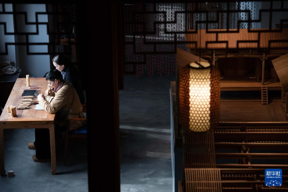 1月7日,在位于安徽省黄山市徽州区的徽州雕刻博物馆,洪建华(前)和妻子张红云在进行竹雕创作。画面右方为洪建华创作的作品。