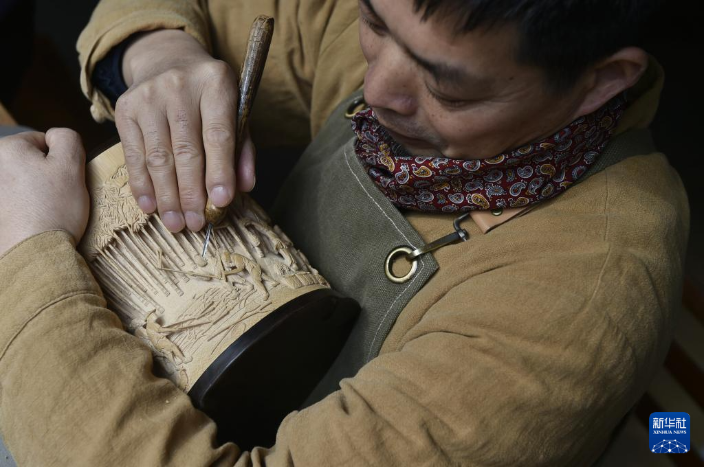 1月7日,在位于安徽省黄山市徽州区的徽州雕刻博物馆,洪建华在进行竹雕创作。