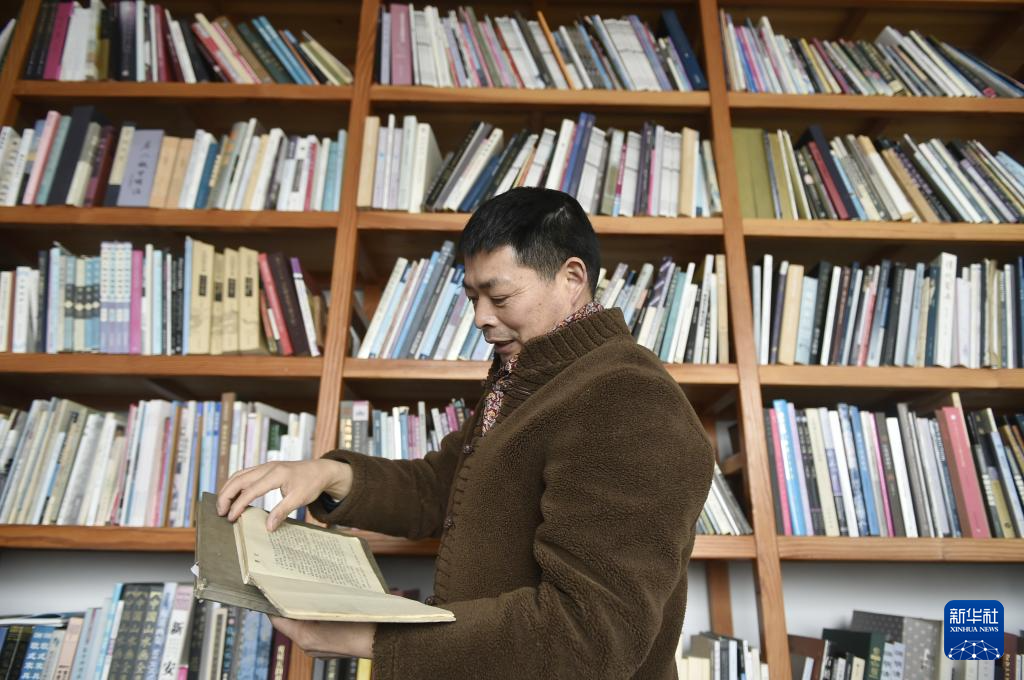 1月7日,在位于安徽省黄山市徽州区的徽州雕刻博物馆,洪建华在翻阅竹雕相关书籍。