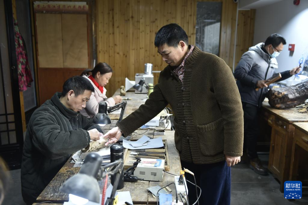 1月7日,在位于安徽省黄山市徽州区的徽州雕刻博物馆,洪建华(右二)指导工匠进行竹雕创作。
