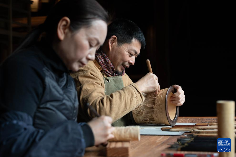 1月7日,在位于安徽省黄山市徽州区的徽州雕刻博物馆,洪建华(右)和妻子张红云在进行竹雕创作。
