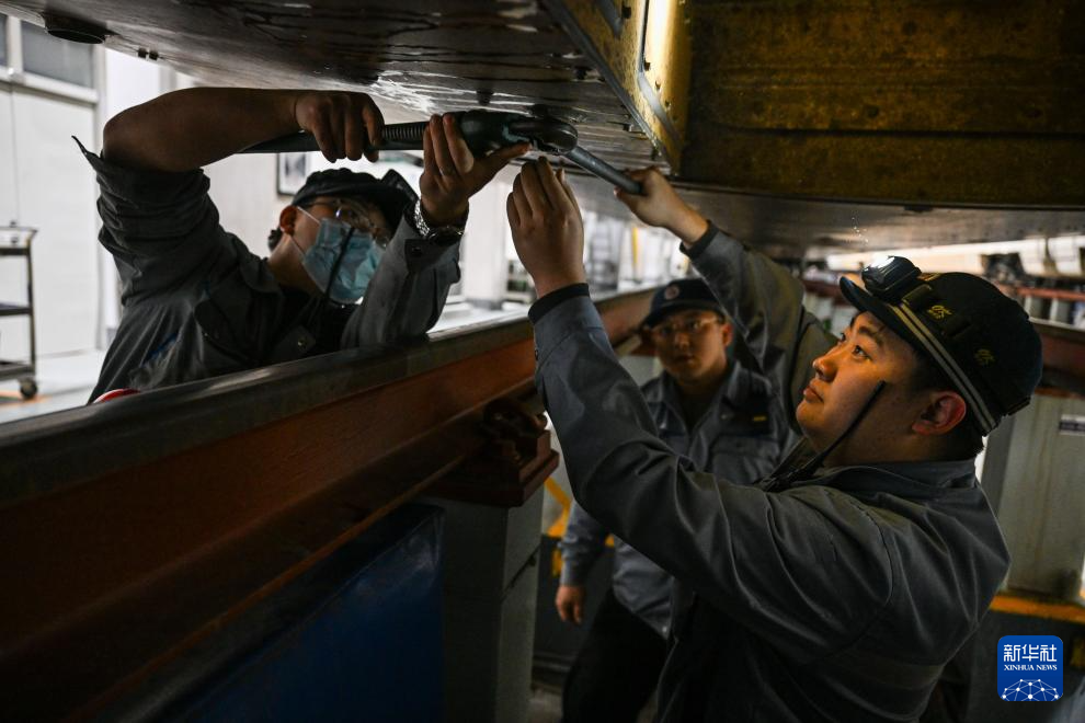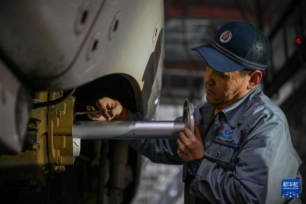 1月17日,工作人员对动车组车底进行检查维修。