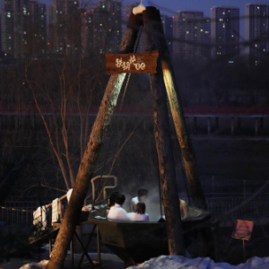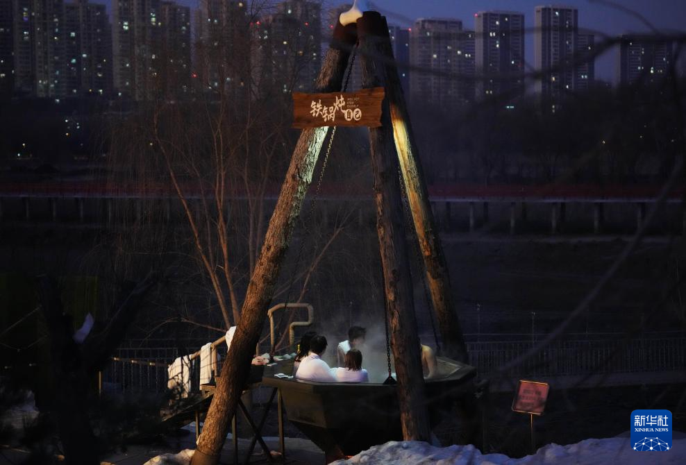 1月17日,在沈阳的清河半岛温泉度假酒店,游客体验冰雪温泉“铁锅炖自己”。