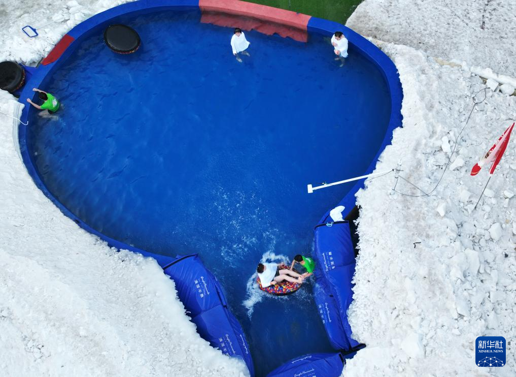 1月17日,在沈阳的清河半岛温泉度假酒店,游客体验冰雪温泉(无人机照片)。