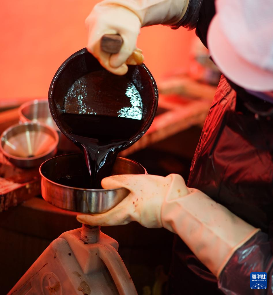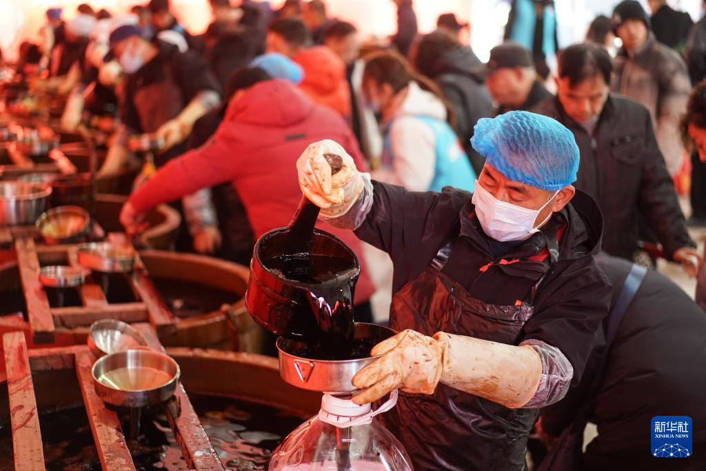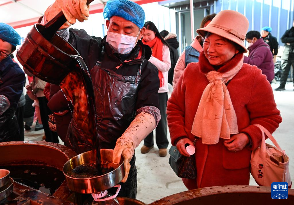 1月18日,工作人员在活动现场为市民打酱油。