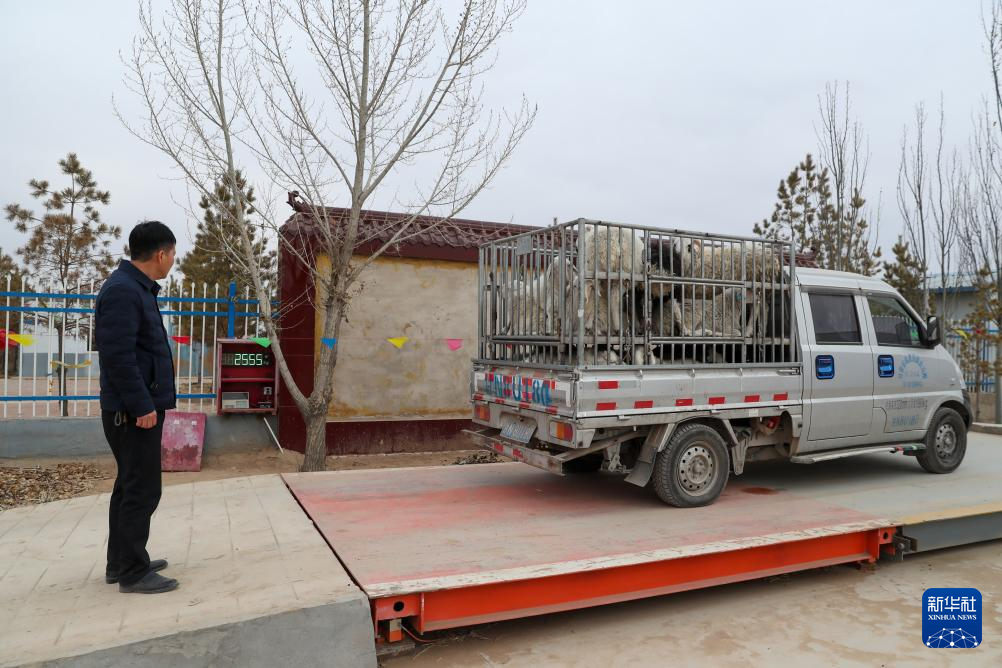 1月17日,在古浪县黄花滩干城乡富民新村的荣海农牧专业合作社,一车出售的肉羊在过称。