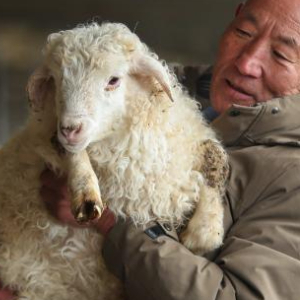 1月17日,在古浪县黄花滩干城乡富民新村,荣海农牧专业合作社负责人在展示小羊羔。