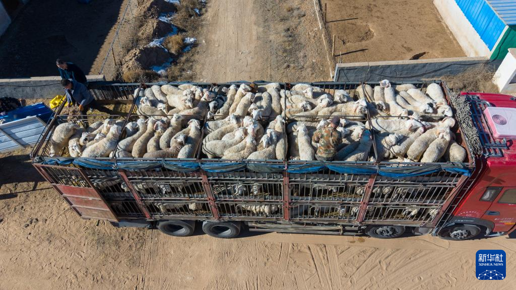 1月16日,在古浪县黄花滩干城乡富民新村的荣海农牧专业合作社,已出售的羊被装上车(无人机照片)。
