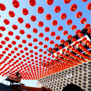 1月20日,工人在山东省青岛市即墨古城悬挂灯笼。