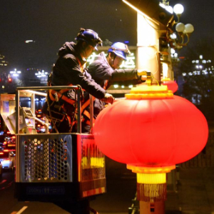 春节即将来临,国网北京市电力公司的城市照明管理中心开始在北京长安街等城市主干道两侧安装大红灯笼、中国结等,喜迎春节。