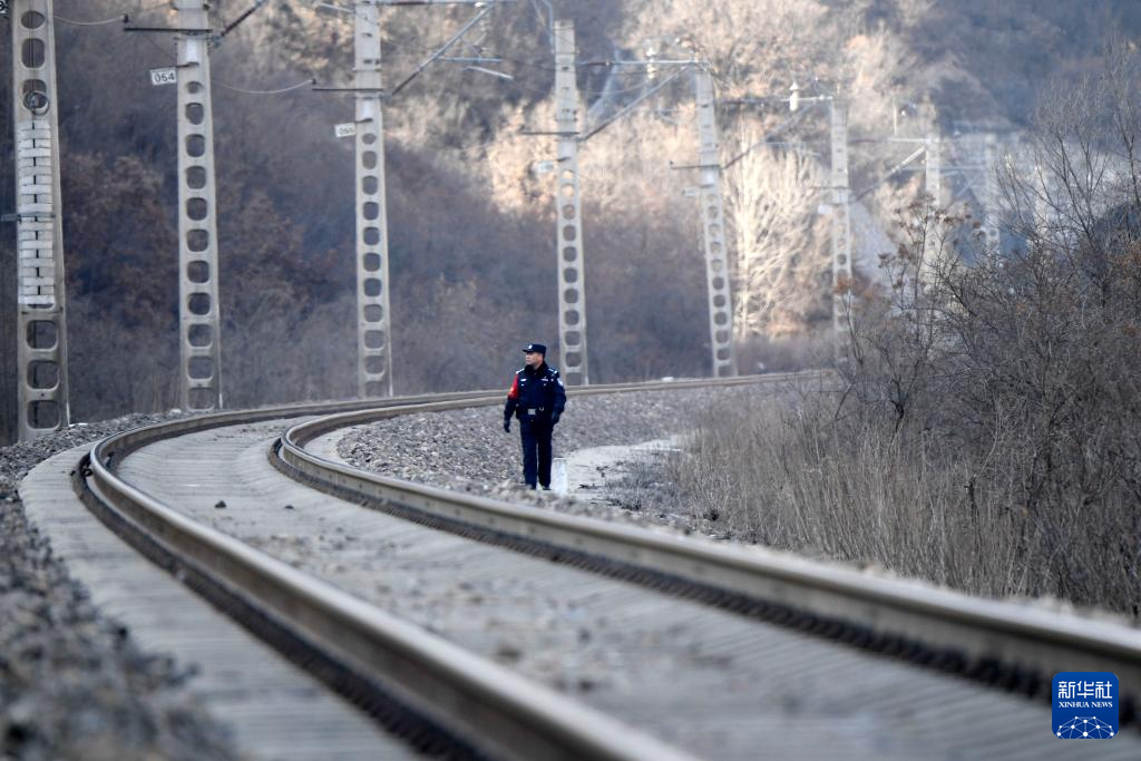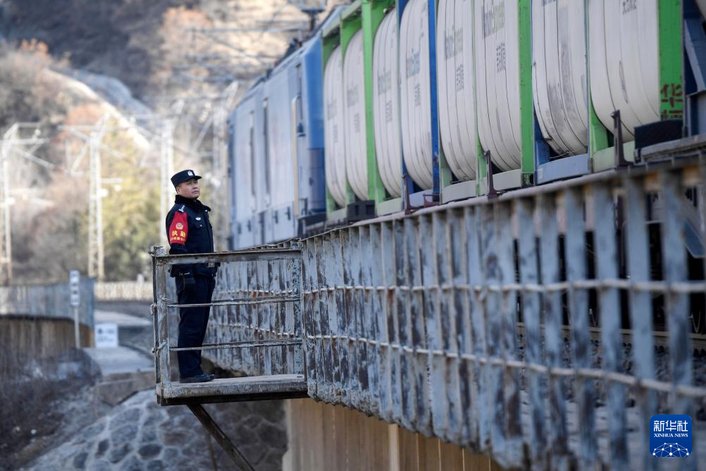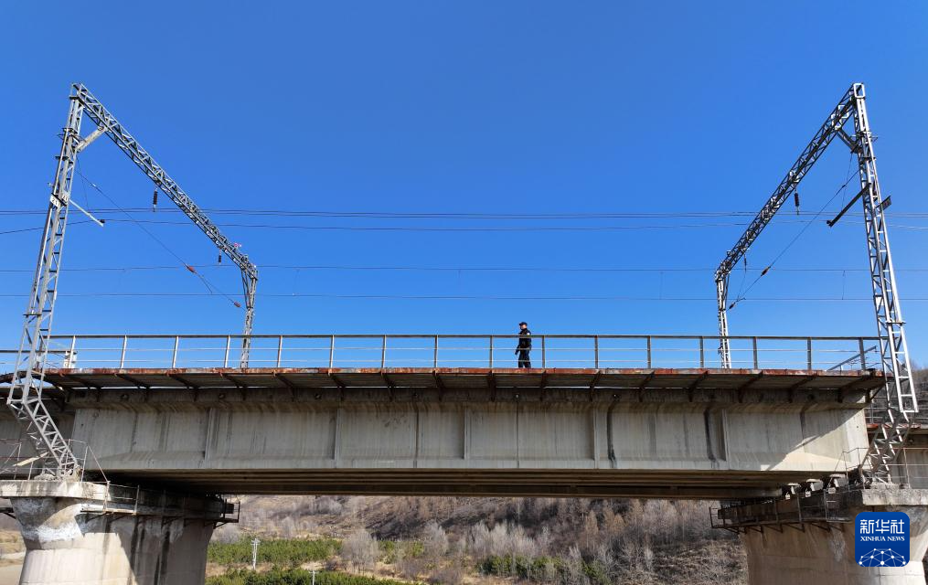 1月21日,马永东在辖区巡线时,目送列车经过铁路桥。