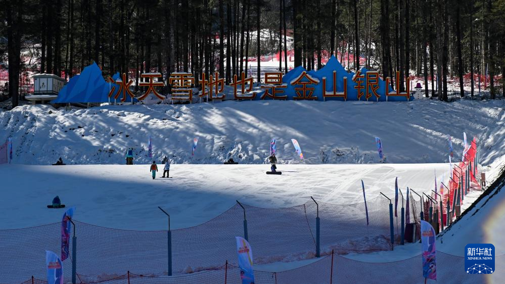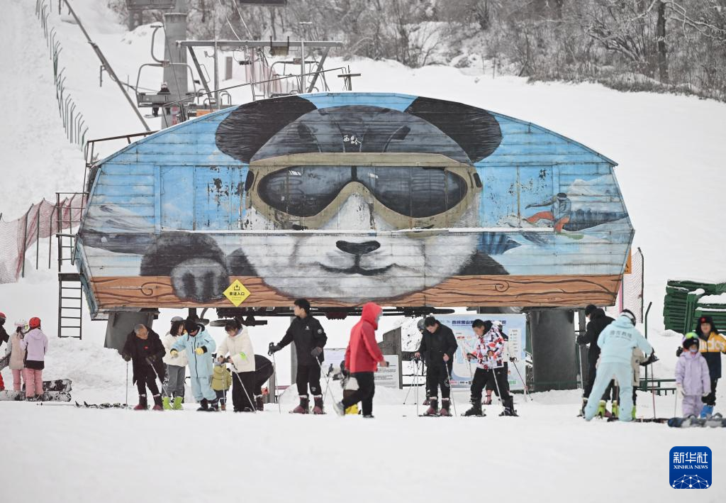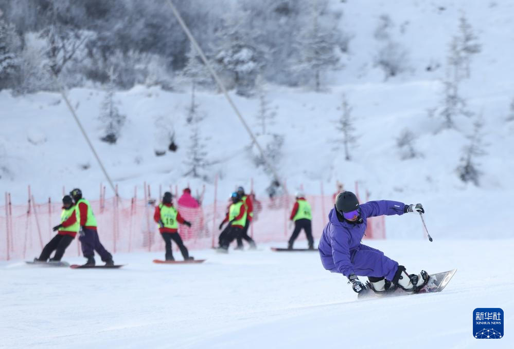 滑雪爱好者在四川省阿坝藏族羌族自治州汶川县羌人谷滑雪场滑雪(2024年12月27日摄)。