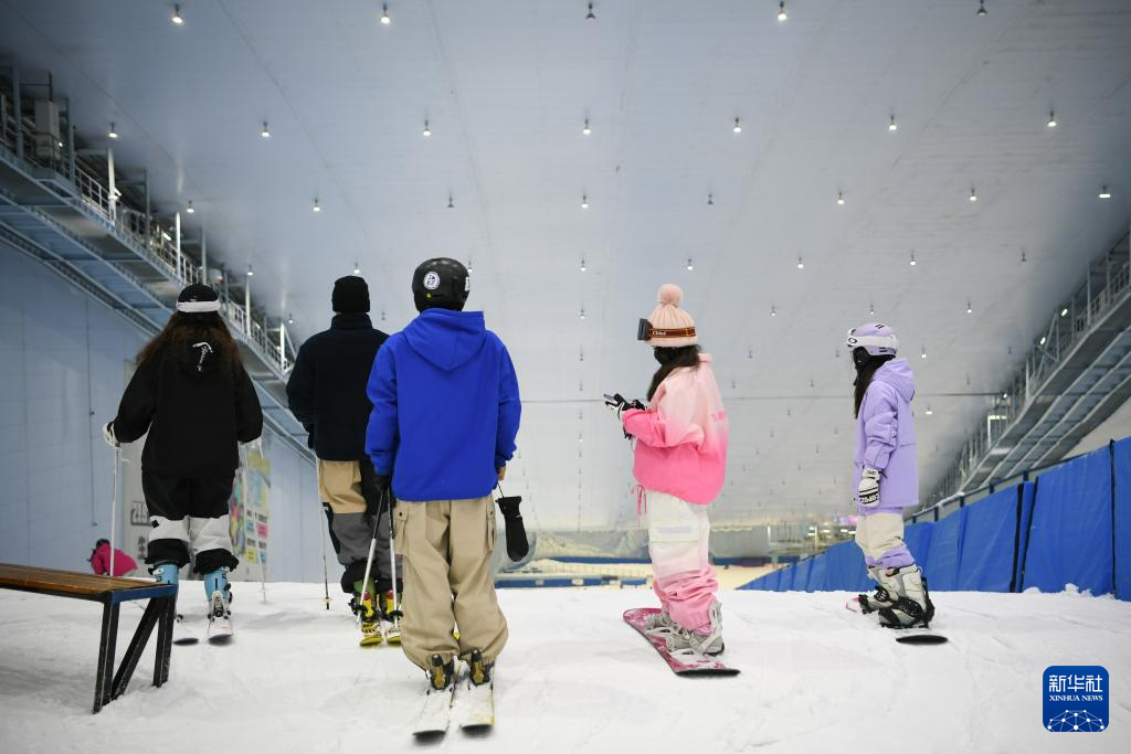 1月12日,在成都热雪奇迹室内滑雪场,滑雪爱好者在雪道上排队等待滑雪。