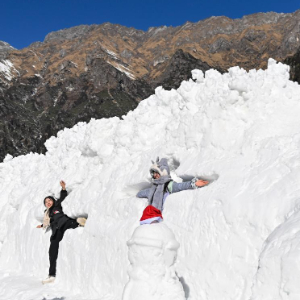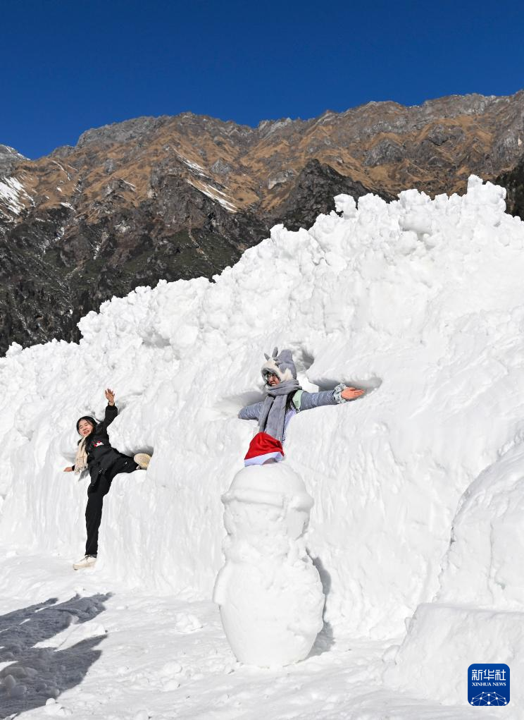 在四川省阿坝藏族羌族自治州汶川县羌人谷滑雪场,游客在雪堆主题装置墙前拍照留念(2024年1月24日摄)。