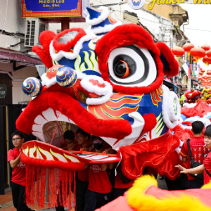 1月21日,在马来西亚马六甲市鸡场街,100人共同舞动一对“马中友谊瑞狮”,庆祝春节的到来 。