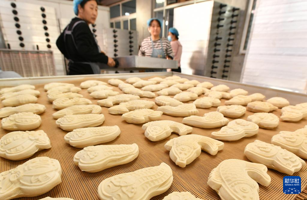 河北沧州渤海新区黄骅市有着过年蒸面花的习俗,随着春节临近,当地面花制作工厂加班加点制作面花,供应春节市场。