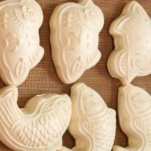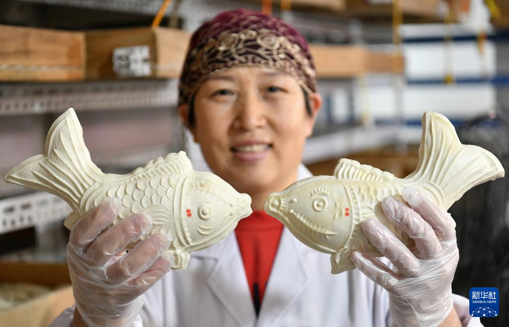 1月23日,河北沧州渤海新区黄骅市一家面花作坊的工人在展示鱼造型的面花。