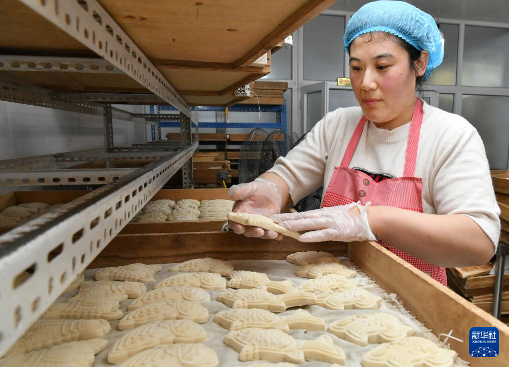 1月23日,河北沧州渤海新区黄骅市一家面花作坊的工人在查看面花。