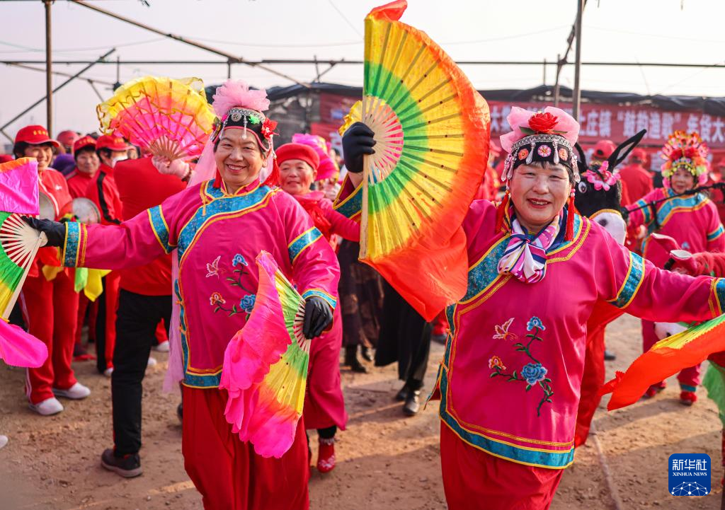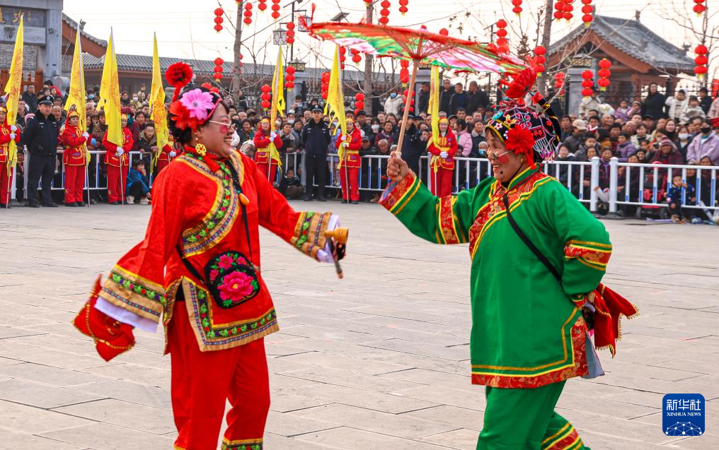 1月23日,在河南省焦作市博爱县柏山镇奉义社区,博爱空竹舞龙艺术团的艺人们为群众表演节目。