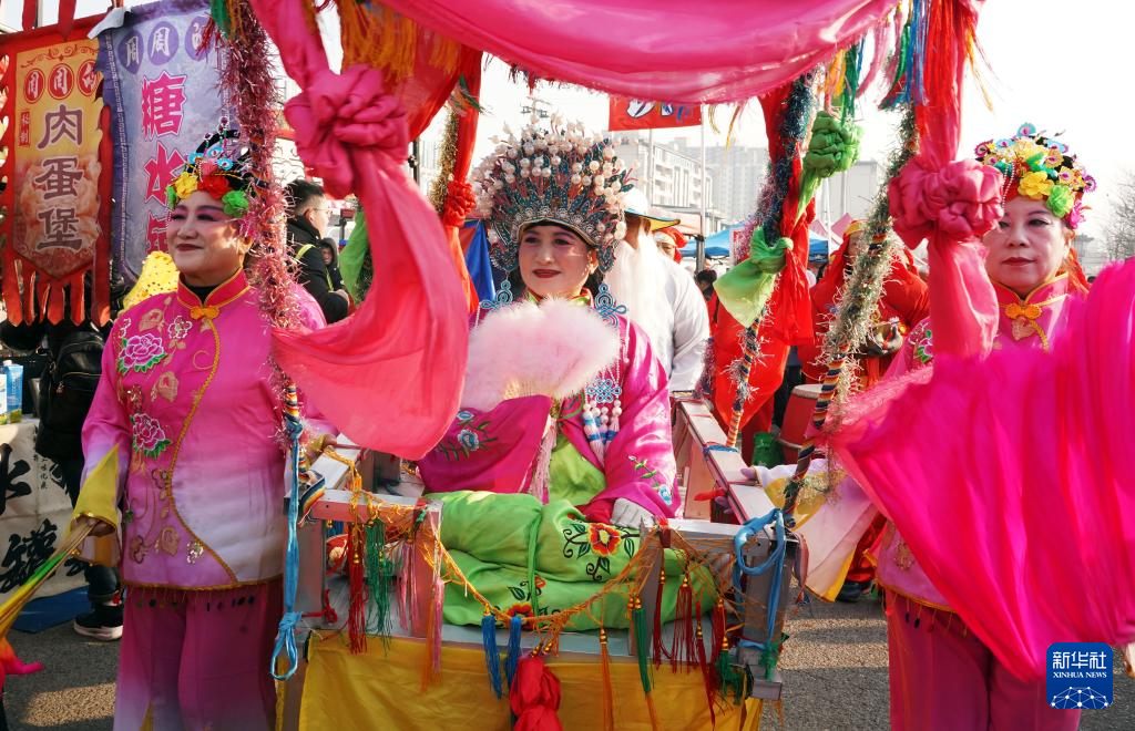 1月23日,民间艺人在河北省遵化市团瓢庄镇山里各庄村的集市上表演民俗节目。