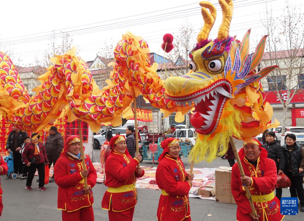 1月23日,山东枣庄山亭区东山亭村农民文艺队在街头表演舞龙。