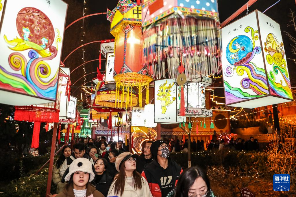 1月23日,游客在河南省开封市清明上河园景区观赏彩灯造型景观。