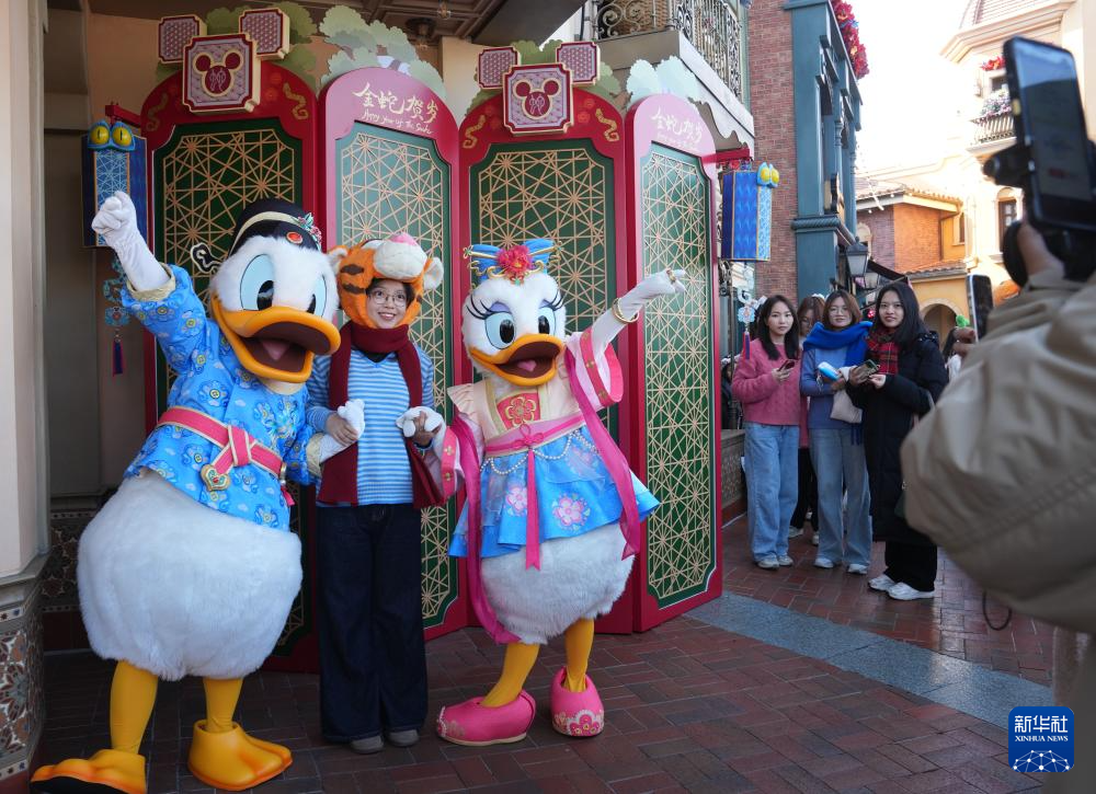 1月22日,游客在上海迪士尼乐园蛇年新春主题装饰前留影。