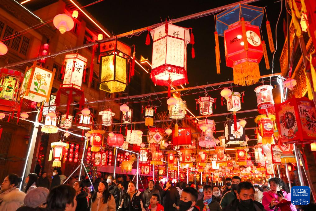 1月22日,游客在甘肃省定西市陇西县北关正街上赏灯游玩。