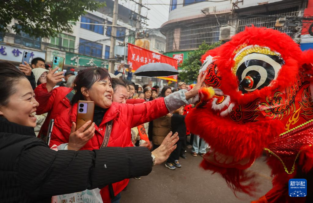 1月23日,在四川省遂宁市蓬溪县蓬南镇新春民俗大巡游活动现场,舞狮者与街头观众互动。