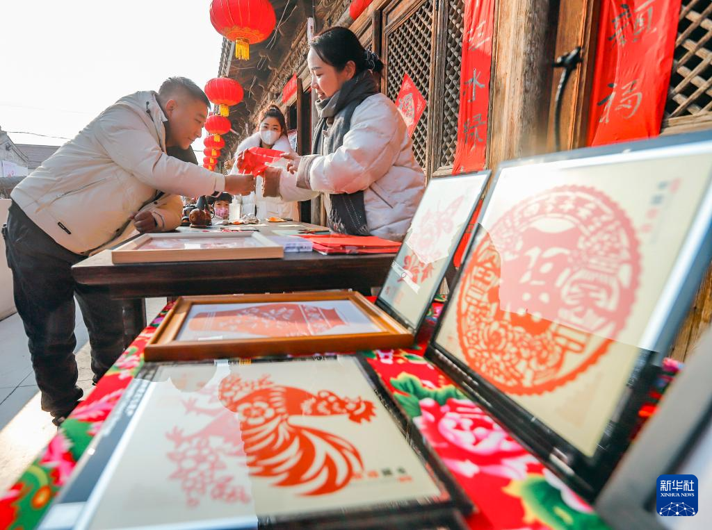 1月23日,人们在河北省遵化市团瓢庄镇山里各庄村的集市上选购剪纸饰品。