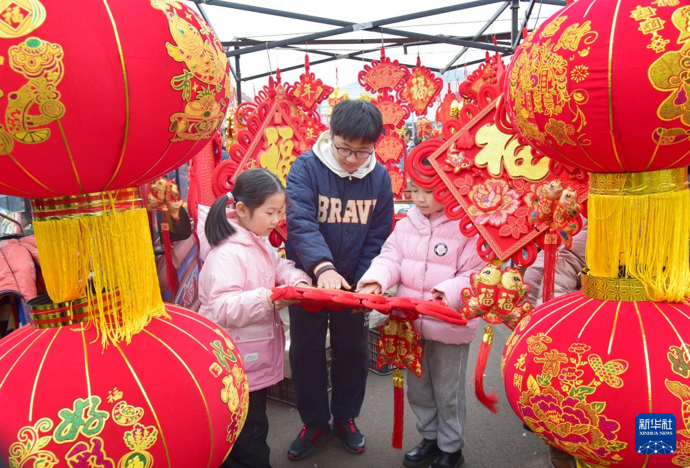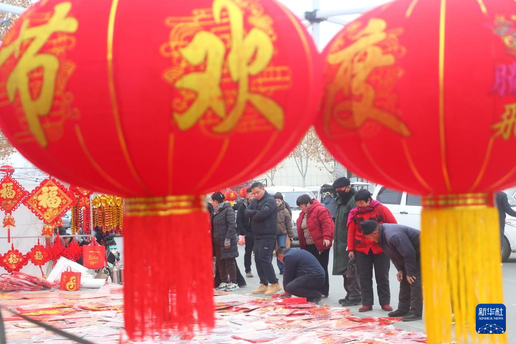 1月23日,人们在山东省枣庄市齐村年集上选购新年饰品。