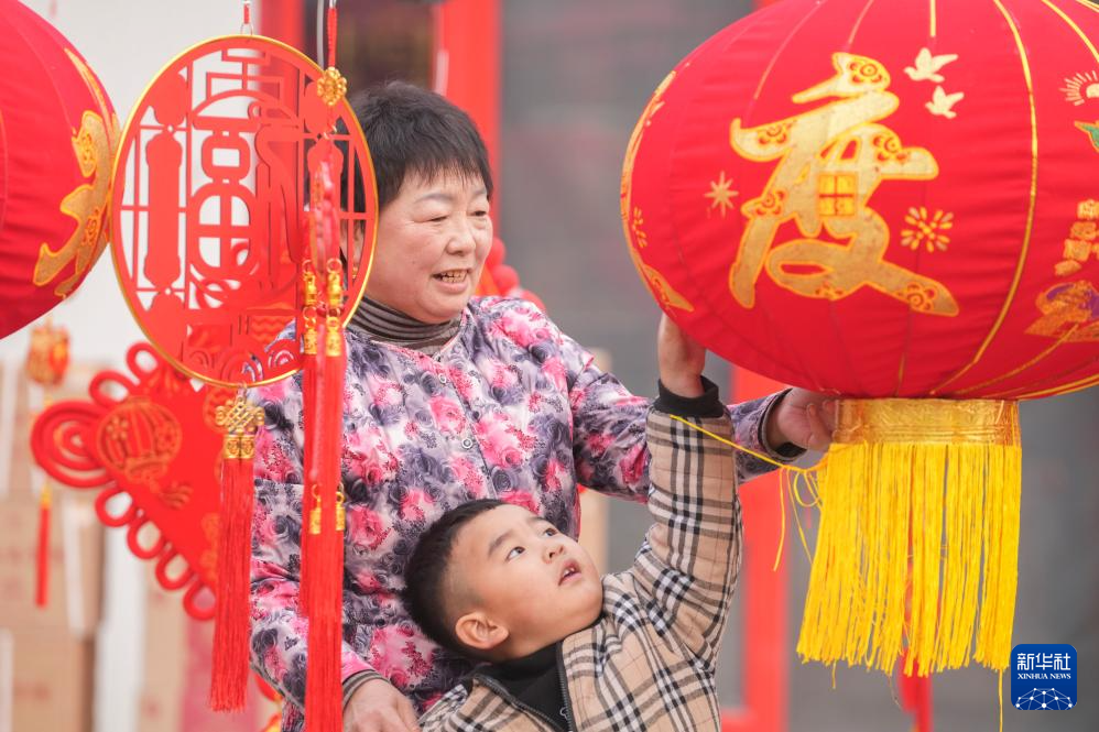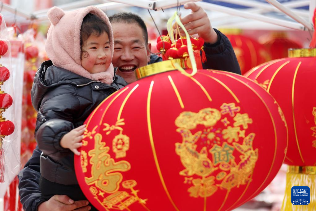 1月23日,在山东省临沂市郯城县郯城街道十里年集上,顾客带孩子选购春节饰品。
