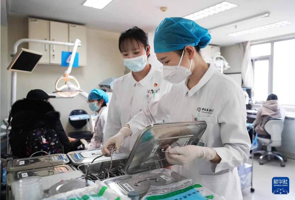 1月23日,在中日友好医院儿童牙颌面畸形早期矫治中心,护士孔祥俊(右一)做治疗前的准备工作。