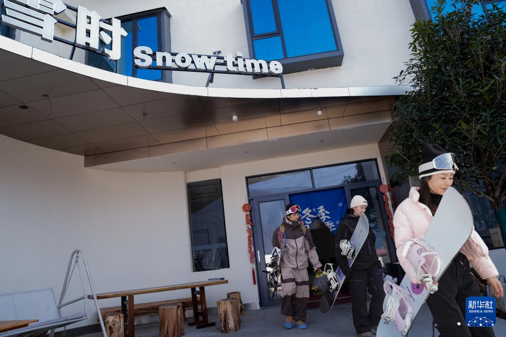 1月18日,在太子岭滑雪场所在的四川茂县南新镇安乡村,几位滑雪爱好者从一家民宿出发前往滑雪场。来太子岭滑雪场的游客带动了当地旅游市场。