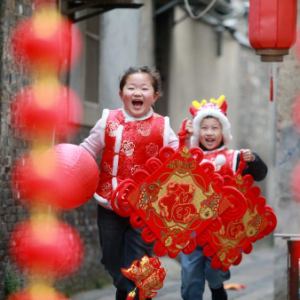 1月24日,在江苏省扬州市何园社区,小朋友们手拿灯笼和中国结开心玩耍。