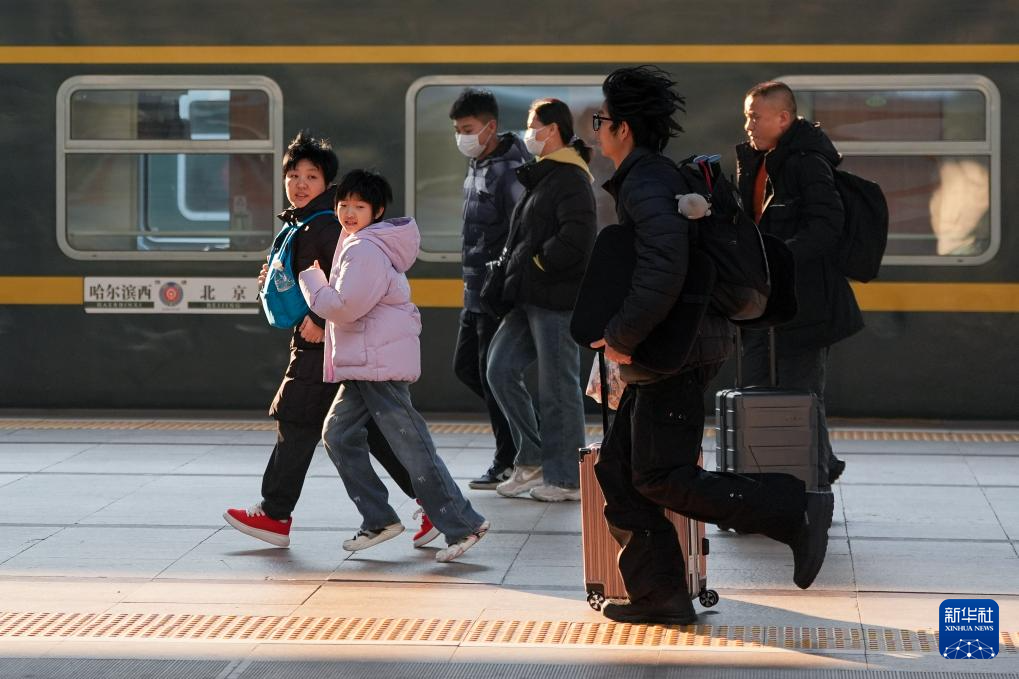 1月24日,在北京火车站,从哈尔滨西开往北京的K340次列车抵达后,下车旅客走在站台上。