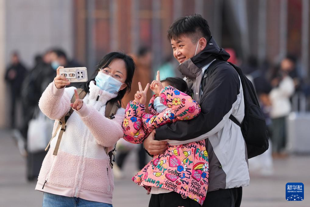 1月24日,一名小朋友(中)在北京站广场上和家人拍照留念。她跟着在深圳工作的父母乘火车来到北京,然后回唐山老家过年。
