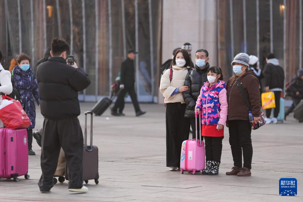1月24日,在北京站广场,几名旅客在合影留念。