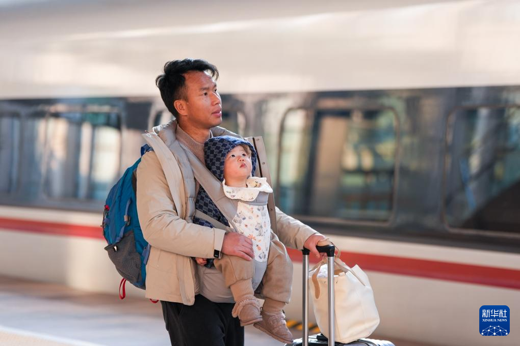 1月24日,在北京火车站,一名家长带着小朋友乘坐G9921次列车。