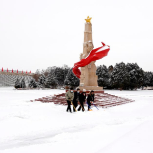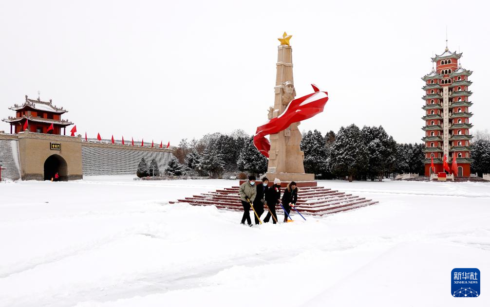 1月25日,工作人员在甘肃省白银市会宁县红军会宁会师旧址景区清理积雪。