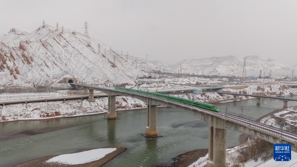 1月25日,一列兰州至中川机场方向的动车组列车驶过一座铁路桥(无人机照片)。为保障降雪天气旅客出行,兰州铁路局加开部分列车。